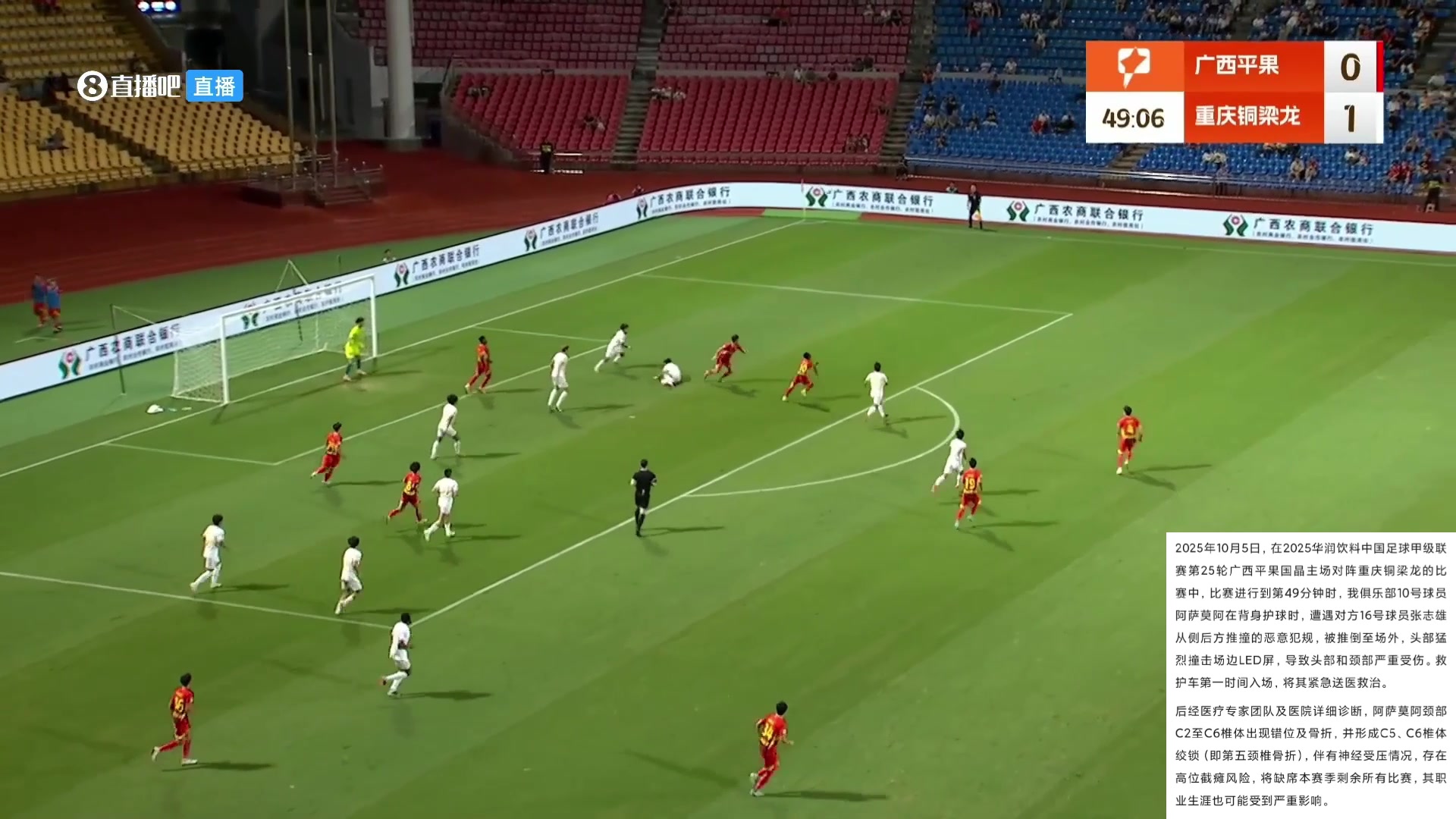 送醫(yī)后查出存在截癱風(fēng)險(xiǎn)中甲外援遭銅梁龍球員犯規(guī)撞到LED屏