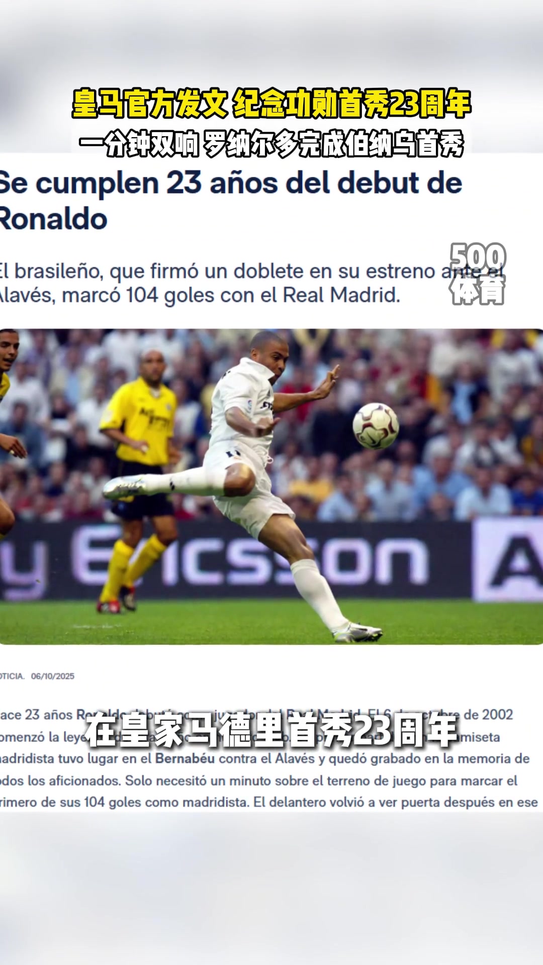 皇馬官方致敬羅納爾多皇馬首秀23周年1分鐘完成雙響