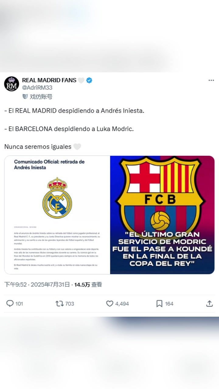 皇馬博主伊涅斯塔退役時皇馬發(fā)公告致敬我們再不會這樣做了