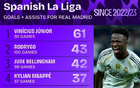 皇馬西甲近3年進球榜:維尼修斯領(lǐng)跑,姆巴佩緊隨其后