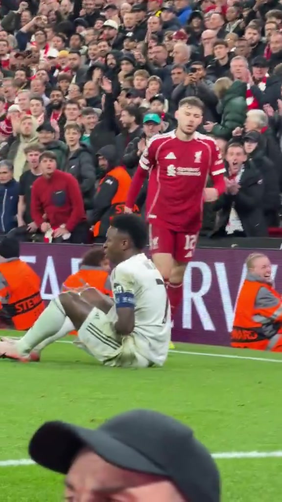 維尼修斯在和布拉德利對抗中倒地慘遭利物浦球迷怒罵